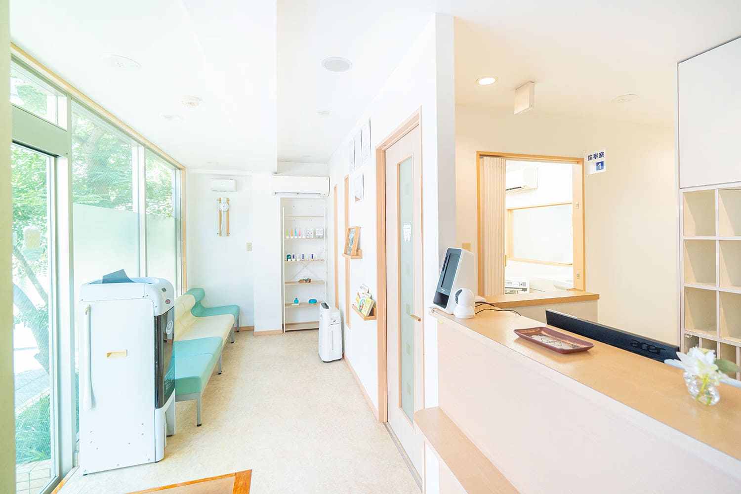 明るい陽射しが差し込む、開放感あふれる待合室です。